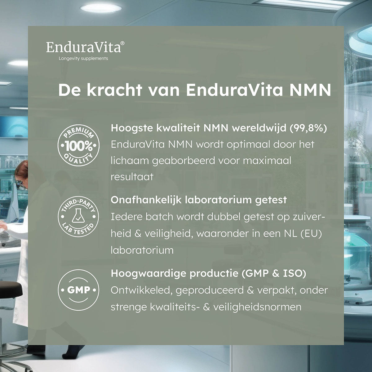 Notre NMN a la plus haute pureté possible de 99,8%. Cela garantit une absorption parfaite par le corps. Le NMN d'EnduraVita est produit selon toutes les normes ISO importantes en matière de sécurité. De plus, le NMN est testé deux fois en laboratoire pour la qualité, la cohérence et la sécurité, y compris dans un laboratoire aux Pays-Bas (UE).